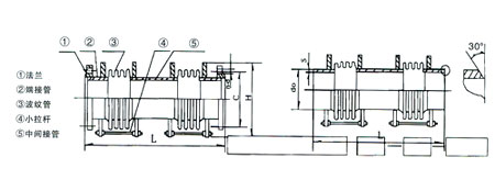 橫向小拉桿波紋補(bǔ)償器由兩段波紋管、中間接管及帶有限螺母的小拉桿等零件組成,它在吸收管系任意平面內(nèi)的橫向位移,同時(shí)吸收軸向位移。小拉桿不能承受內(nèi)壓推力。